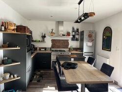A vendre Locminé, Idéalement située dans une résidence calme proche du centre-ville de Locminé, commodités accessibles à pied, maison de plain-pied très rare sur le secteur comprenant : une entrée, une pièce de vie agrémentée d'un poêle à bois, avec une cuisine ouverte aménagée/ équipée (piano (four plaque gaz), hotte, réfrigérateur, lave-vaisselle), une première chambre avec coin dressing, une seconde chambre, une salle d'eau avec doubles vasques, des sanitaires. Un garage attenant à la maison. Le tout sur un beau terrain clos d'environ 400m² comprenant un cabanon de jardin et une terrasse carrelée avec pergola exposée sud-ouest. DPE EN COURS (5.55 % honoraires TTC à la charge de l'acquéreur.)