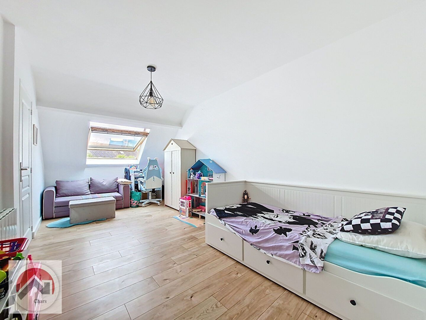À l'étage ; palier, trois chambres, salle d'eau + WC. Beaucoup de rangements dans mais chambres.