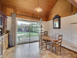 À l'étage : Le palier dessert deux chambres, dont une avec espace sous-pente, une mezzanine pouvant servir de bureau ou coin détente, ainsi qu'une salle de bain avec WC. Un agencement pratique pour répondre aux besoins de toute la famille.