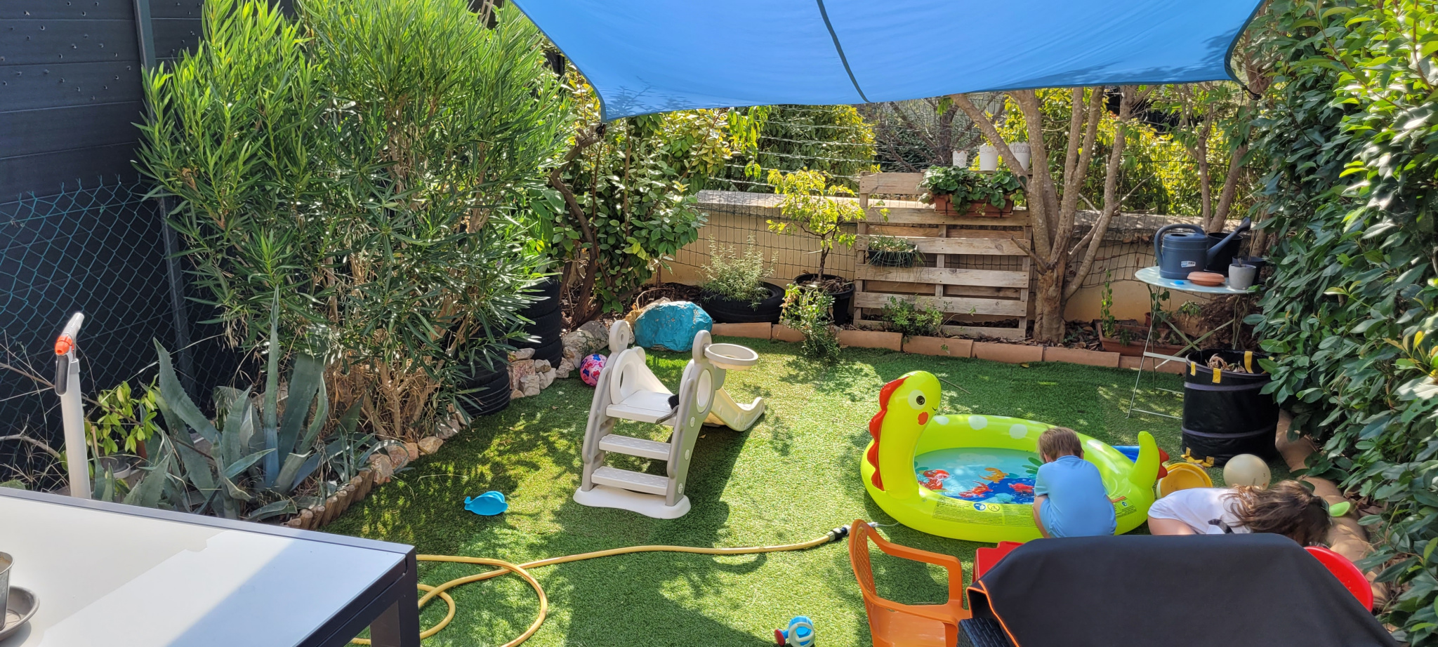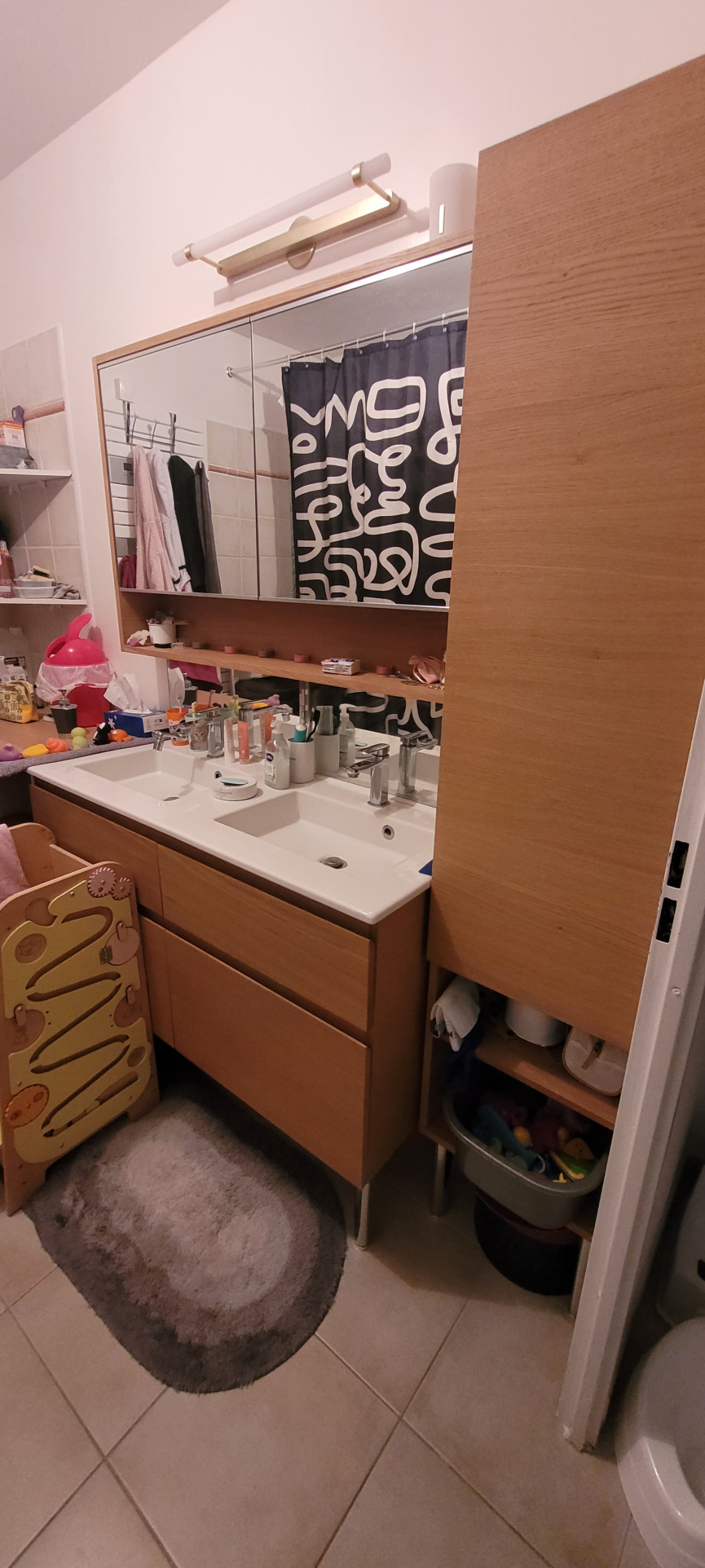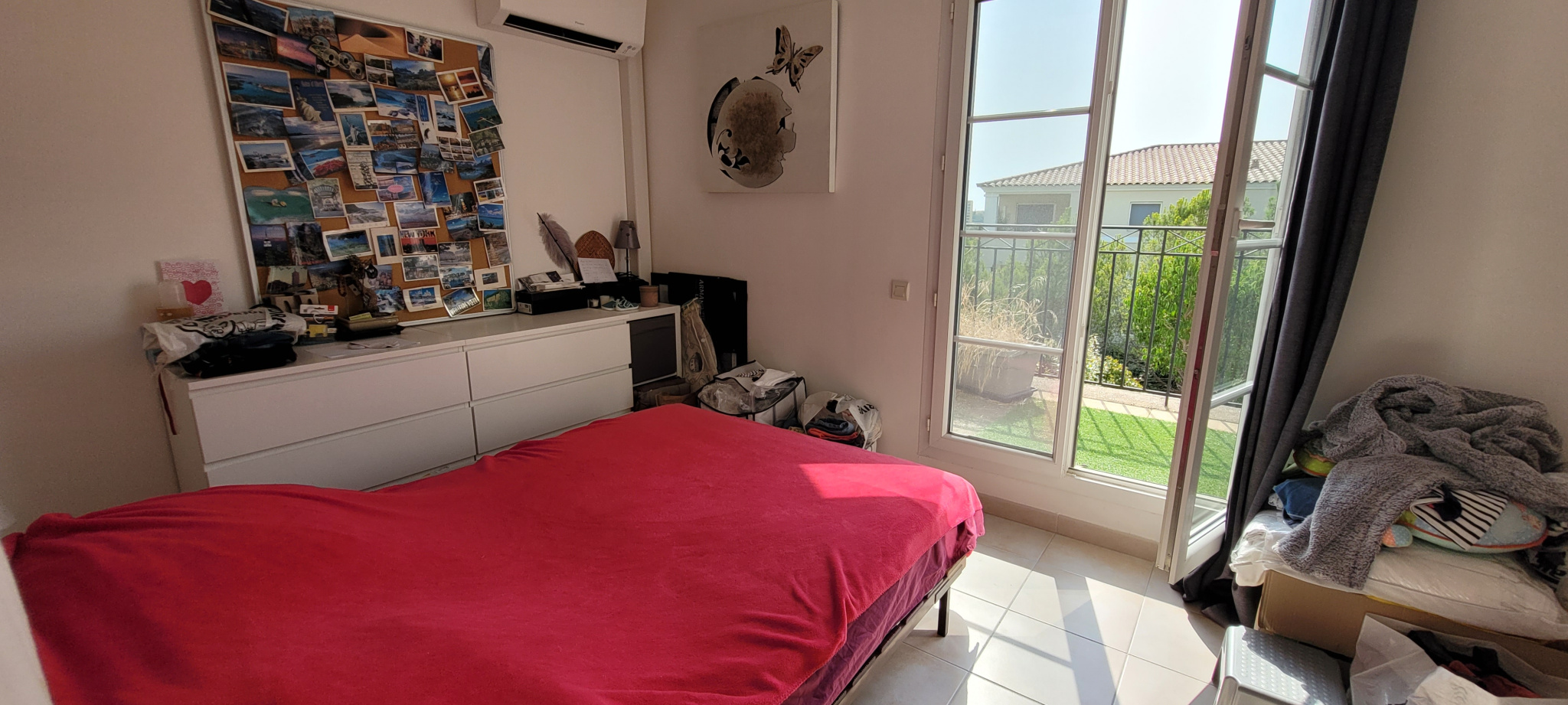A l'étage, l'optimisation de l'espace a été pensée dans les moindres détails : un coin bureau, une chambre climatisée avec placard aménagé, une salle de bains moderne avec double vasque, un second WC, ainsi qu'une seconde chambre climatisée avec terrasse privative surplombant le jardin.