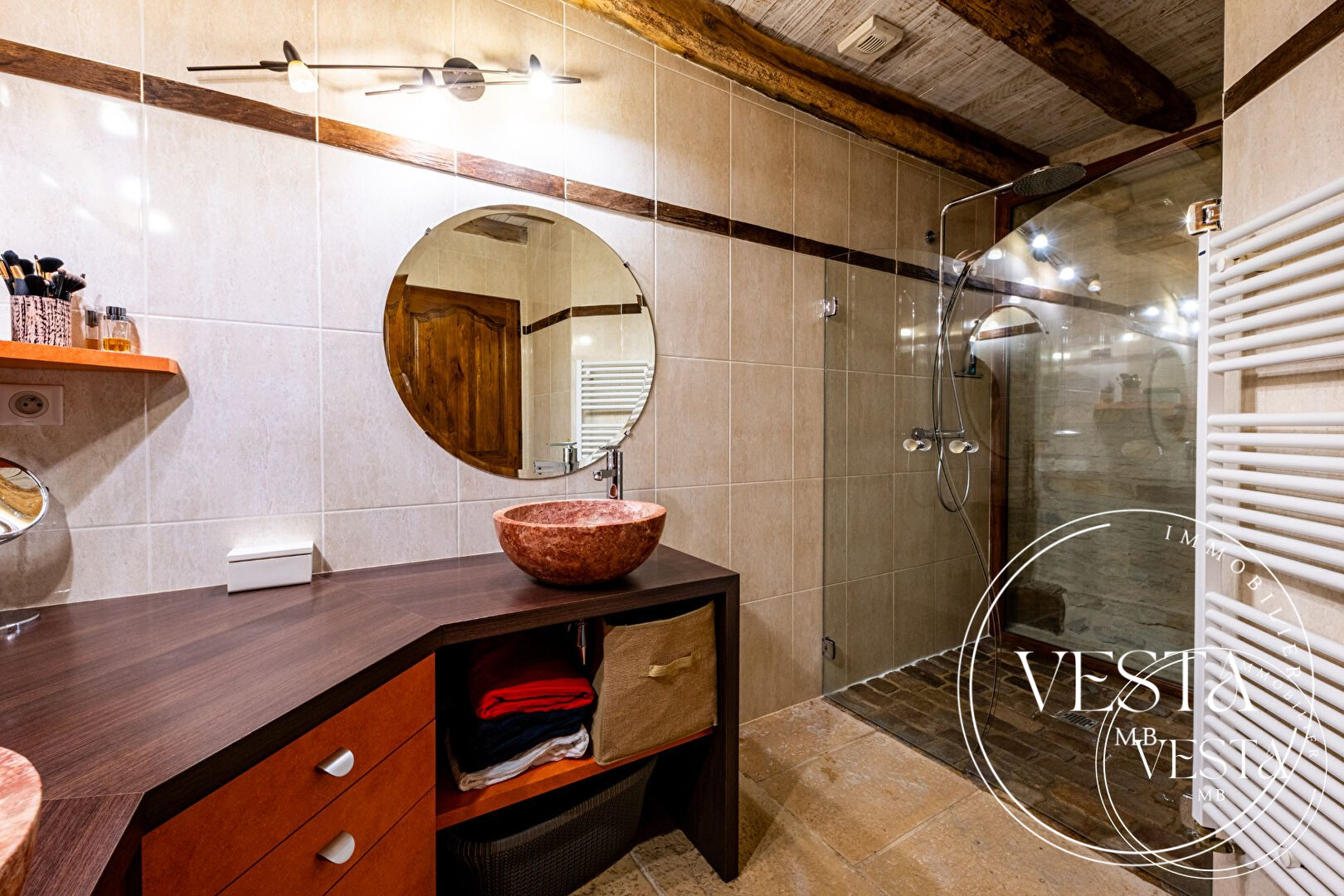 Dès l'entrée, vous serez séduit par le cachet exceptionnel de la maison : plafonds à la française, escalier en chêne massif taillé par les réputés compagnons du devoir, volumes généreux et matériaux nobles.