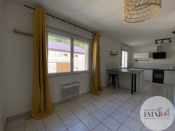 Belle Maison de 85.36m2 offrant au RDC entrée, une chambre et un bureau avec dressing, accès double garage avec cellier, terrasse de 45m2 et jardin d'environ 400m2. Accès du jardin par le garage. A l'étage 2 chambres, cuisine équipée ouverte sur séjour (hotte, four, plaque de cuisson et lave vaisselle), salle de bains et toilettes. Chauffage Elec. Disponible le 30/01 !