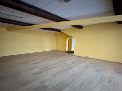 RDC : Grand plateau avec sol rénové (parquet chêne clair), poutres apparentes, accès par double porte vitrée sécurisée (grille). Idéal accueil, showroom ou transformation en garage.