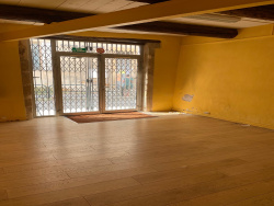 RDC : Grand plateau avec sol rénové (parquet chêne clair), poutres apparentes, accès par double porte vitrée sécurisée (grille). Idéal accueil, showroom ou transformation en garage.