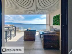 L'appartement entièrement meublé est composé, d'un hall d'entrée avec rangements, d'un WC invité, d'un grand salon/séjour donnant sur une terrasse de 25,00 m² pleine vue mer, d'une cuisine moderne entièrement équipée.