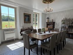 Située en pleine campagne gersoise, à quelques minutes d'un village avec école et commerces, cette ancienne bâtisse en pierre de 1764 vous séduira par son caractère authentique et son potentiel. Jadis presbytère, elle a été soigneusement rénovée et conserve aujourd'hui tout le charme des demeures anciennes : poutres apparentes, escalier en bois massif, cheminées en marbre, un évier en pierre et le hall d'entrée avec ses tomettes. Offrant environ 250 m² habitables, la maison est parfaitement adaptée à une activité de chambres d'hôtes, avec quatre chambres spacieuses, quatre salles de bains. Une cinquième chambre ou gîte pourrait être envisagé grâce aux espaces encore à aménager (plus de 100 m² disponibles), notamment dans le pigeonnier ou l'ancien atelier. La cuisine, à la fois fonctionnelle et élégante, est équipée de mobilier Sagne et d'appareils haut de gamme : piano de cuisson à gaz Lesure, grand réfrigérateur américain, micro-ondes, deux fours et lave-vaisselle Siemens. La salle à manger qui est lumineuse et ouvre directement sur le jardin par des portes fenêtres. Le séjour, chaleureux et lumineux, est agrémenté d'un poêle à bois pour les soirées d'hiver. À l'extérieur, un jardin arboré de deux hectares entoure la maison : cèdres centenaires, vieux chênes, arbres fruitiers, potager, mare naturelle alimentée par un petit ruisseau, ainsi qu'un puits en pierre. Un second terrain de deux hectares, de type prairie, complète cet ensemble bucolique, idéal pour chevaux ou projets agricoles. La piscine au chlore, installée en 2019, mesure 11 x 4 mètres et bénéficie d'une belle exposition plein sud avec vue sur les collines. Les dépendances comprennent un garage spacieux de 52 m² avec borne de recharge électrique, une ancienne volière en pierre aménagée en cuisine d'été avec appentis, un ancien chai d'Armagnac en pierre et une petite grange sont à restaurer. L'ensemble est en bon état général : toiture et isolation refaite en 2014 (toutes les tuiles et la charpente à moitié), fenêtres double vitrage PVC dans toute la maison, climatisation réversible dans la salle à manger et la cuisine, poêle à bois dans le salon. L'assainissement individuel est à remettre aux normes. Cette propriété combine espace, caractère, intimité et potentiel touristique ou familial dans l'un des secteurs les plus recherchés du Gers. N'hésitez pas à nous contacter pour plus d'informations ou une visite.