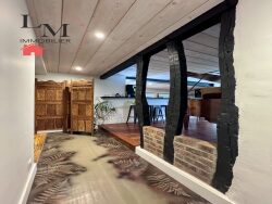 La maison principale s'ouvre sur une grande entrée majestueuse, puis une petite véranda aménagée en coin cosy, idéale pour la lecture ou la détente. Le coeur de la maison se compose d'un grand séjour cathédral avec cuisine américaine équipée ouverte sur la pièce de vie.