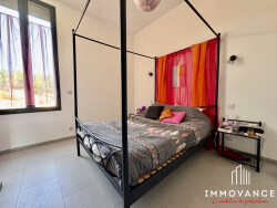 Les extérieurs prolongent agréablement la maison : un jardin méditerranéen de plus de 660 m², une piscine à l'abri des regards, une grande terrasse et un garage complètent l'ensemble. Une ancienne cuve de vinification a été transformée en cave à vin, clin d'oeil au passé viticole de la région.