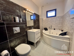 La surface habitable d'environ 340 m² s'articule autour d'un vaste séjour de 90 m², baigné de lumière grâce à ses larges ouvertures à galandage donnant sur le jardin. La cuisine, au design épuré, a été pensée pour la convivialité et la fonctionnalité. L'étage accueille une suite parentale avec dressing et salle d'eau, une seconde suite, deux chambres supplémentaires et une chambre junior, toutes tournées vers la verdure et la tranquillité. À ce niveau, une pièce supplémentaire de plus de 90 m² offre un superbe potentiel d'aménagement : atelier, salle de sport, espace bien-être ou extension locative selon vos besoins.