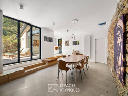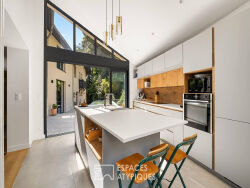 Située sur la commune de Lyon 9, dans le village de Saint Rambert, face à l'île Barbe, cette maison de caractère de 223 m² est le fruit de la rénovation par un architecte d'anciennes écuries. Elle s'élève sur un terrain arboré et bucolique de 5 000 m² et profite d'une belle terrasse avec piscine. Dès l'entrée par le grand portail, le murmure de la source et le petit bassin des carpes Koï introduisent la quiétude des lieux. Une vaste terrasse mène ensuite à la partie principale de la maison. Le hall d'entrée, dont le caractère affirmé rappelle l'histoire des anciennes écuries, bénéficie de nombreux rangements et marque une véritable transition avec l'extérieur. Une première suite avec salle d'eau prend place à ce niveau, offrant un espace nuit indépendant, idéal pour un adolescent ou des convives de passage. L'espace de vie s'organise en enfilade de plusieurs parties ouvertes. Un salon de réception, réchauffé par son poêle à granulés lors des soirées d'hiver, s'ouvre sur une grande baie vitrée laissant entrevoir la piscine et la végétation environnante. La salle à manger, idéalement positionnée, conduit à la cuisine contemporaine et design. Celle-ci, issue d'une extension moderne, bénéficie d'une lumière traversante et d'un accès aux deux terrasses. A l'étage, la partie nuit a été entièrement repensée. Une suite parentale avec dressing et salle d'eau occupe une aile de la maison, offrant un espace intime aux parents. Deux autres chambres se partagent une salle de bains contemporaine, le tout distribué par un couloir lumineux qui conserve le charme d'antan. L'une des chambres profite d'une grande mezzanine optimisant l'espace. Une pièce discrète complète ce niveau, pouvant servir de bureau, coin lecture ou tout autre usage nécessitant tranquillité. Le jardin paysager, riche en plantations et agrémenté d'arbres centenaires, compose un véritable tableau changeant au fil des saisons. Ses dimensions très généreuses garantissent une parfaite intimité. En résumé, cette maison au cachet certain, rénovée avec des matériaux de haute qualité, offre un équilibre parfait entre vie citadine et douceur campagnarde. Véritable coup de coeur, elle se situe à proximité des commerces de Saint Rambert, de la Saône, ainsi que de toutes les commodités et des transports urbains. Cave voûtée de 17 m² Garage fermé Chauffage au gaz et poêles à granulés DPE : C / GES : C Montant moyen estimé des dépenses annuelles d'énergie pour un usage standard, indexées aux années 2021, 2022, 2023 : entre 3 160 euros et 4 340 euros (abonnement compris). Contact : Céline - 06 75 44 67 18 Celine KANNENGIESSER (EI) Agent Commercial - Numéro RSAC : 949 658 371 - LYON.