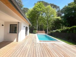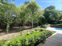 Elle offre un bel espace de vie baigné de lumière prolongé par une terrasse et un jardin avec piscine le tout profitant d'une vue dégagée sur la forêt environnante.