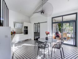 D'une superficie de 180m² habitables, elle mêle harmonieusement cachet de l'ancien et lignes plus actuelles grâce à une extension contemporaine qui accueille aujourd'hui un vaste et bel espace de vie baigné de lumière exposé plein sud.