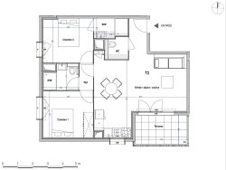 Cet appartement se compose d'une entrée avec wc desservant un spacieux séjour avec cuisine américaine s'ouvrant sur sa terrasse au Sud, de deux chambres à coucher à l'Ouest dont une en suite avec sa salle d'eau et d'une seconde salle d'eau avec toilettes.