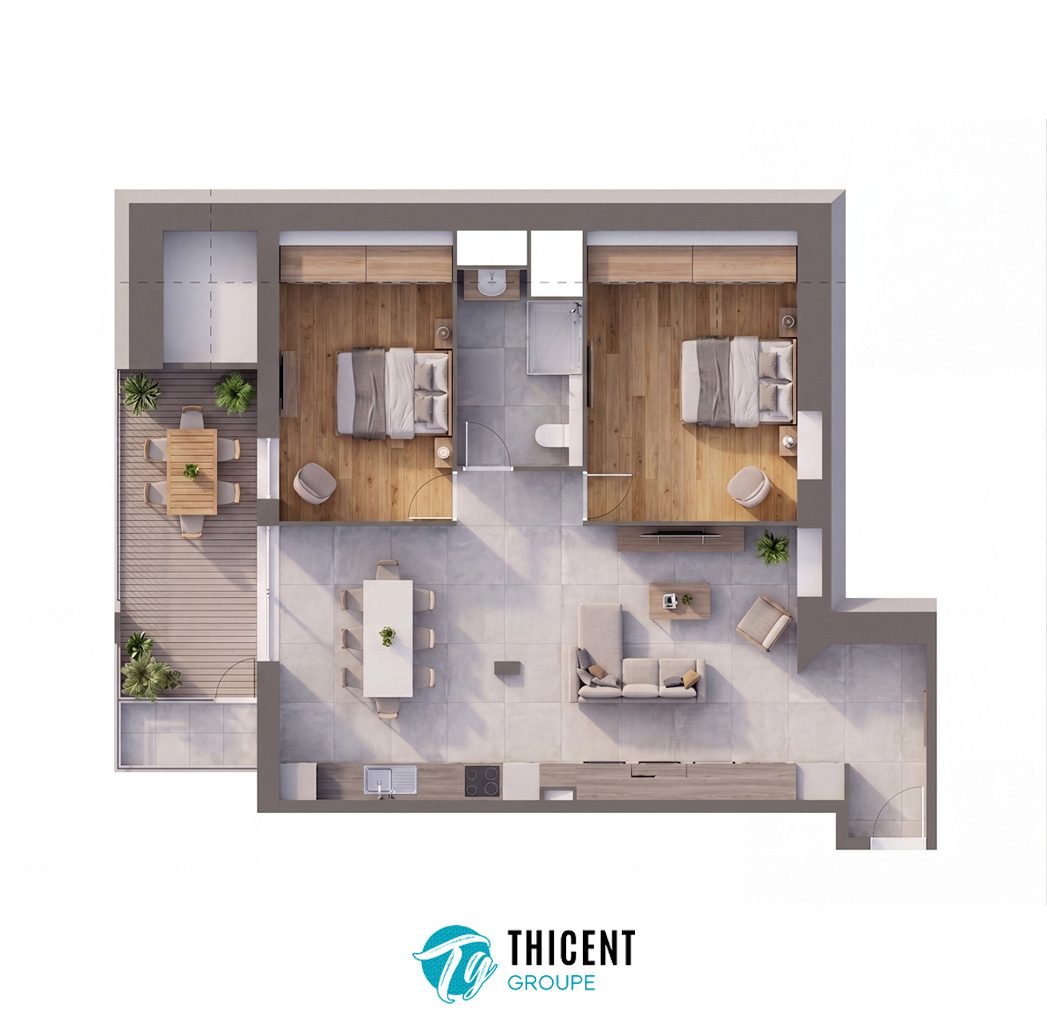 Avec ses 65,06 m² habitables, cet appartement offre une distribution fonctionnelle et agréable. Le logement s'articule autour d'un séjour/cuisine de 27,56 m², lumineux et convivial, idéal pour recevoir ou profiter à deux. Il dispose de deux belles chambres de 12,02 m² et 10,25 m², offrant chacune un espace confortable et reposant. L'espace nuit est complété par une salle d'eau de 3,95 m² et des WC séparés. La circulation est fluide grâce à une entrée généreuse de 6,55 m² et un dégagement de 3,01 m².