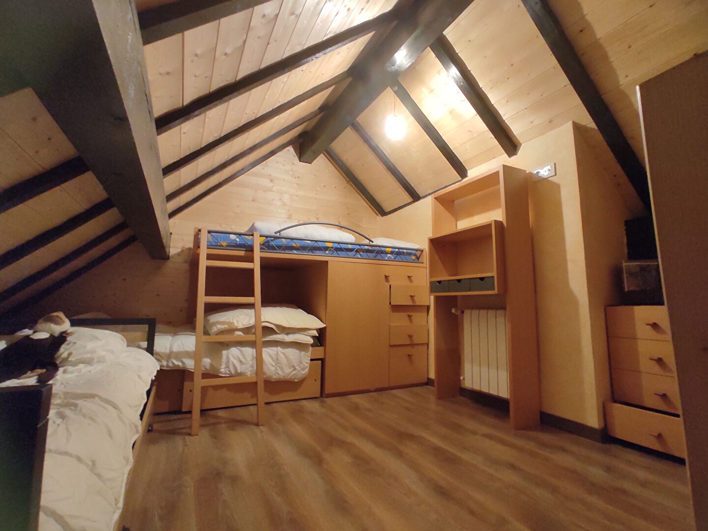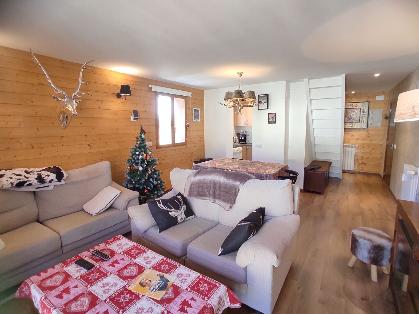 APPARTEMENT au dernier étage , triplex d'une superficie de 53 M² , comprenant au premier niveau, séjour avec bacon, cuisine ouverte équipée, au 1 er niveau relié par un escalier intérieur, 2 chambre , salle de bains avec WC, et au 2 -ème niveau une chambre sous toit. Dans une copropriété proche des commerce et de la navette gratuite. Casier à ski, parking copropriété.