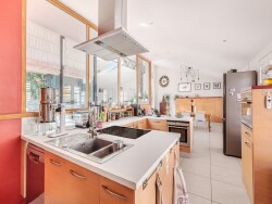 Nichée au premier étage, la pièce de vie de plus de 80 m² déploie des volumes généreux. L'asymétrie de ces volumes délimite judicieusement l'espace entre cuisine équipée, salle à manger et salon chaleureux. Que l'on se tourne vers la douce chaleur de la cheminée en hiver, vers les baies vitrées qui offrent luminosité et vue privilégiée en toute saison ou vers la terrasse et sa piscine en été, tout est douceur de vivre et harmonie.