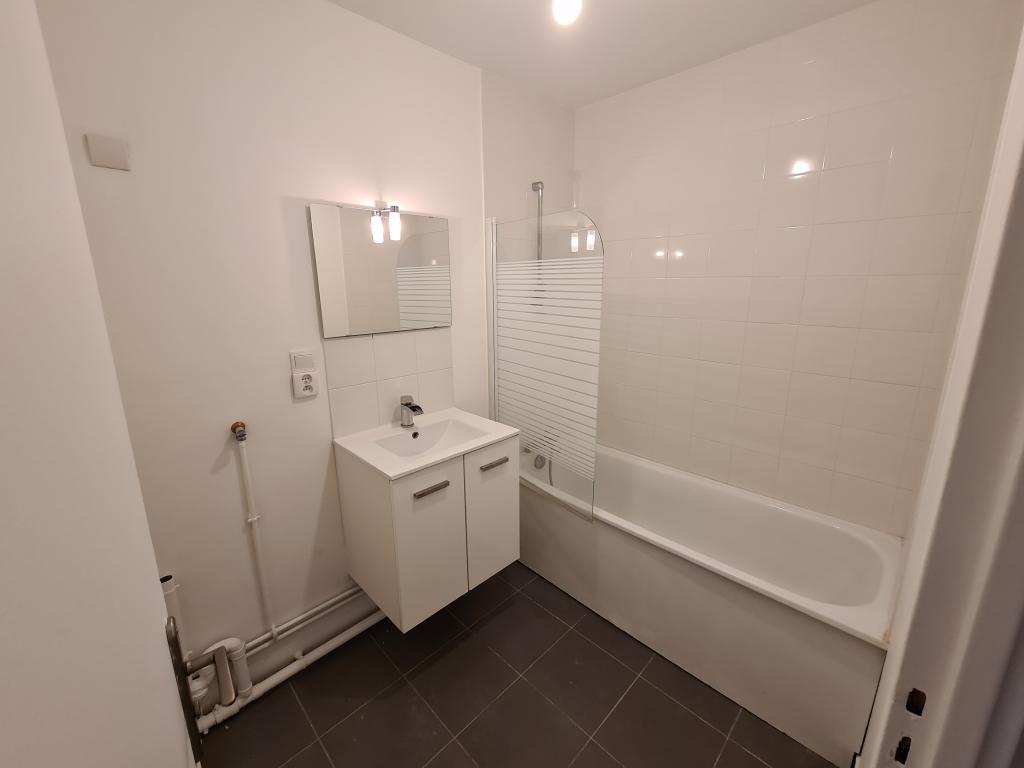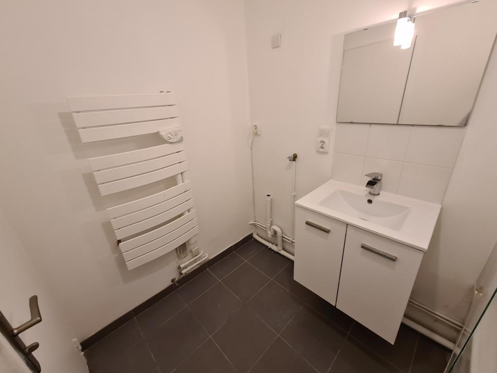 <p>- une grande salle de bains avec une machine à laver et des rangements </p>