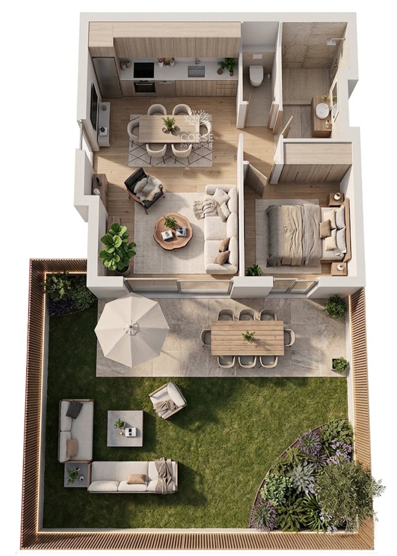 CORSE PATRIMOINE IMMOBILIER a sélectionné ce nouveau programme unique, conçu pour offrir bien-être, élégance et sérénité au coeur d'un environnement préservé. Cet ensemble à taille humaine réunit 20 logements contemporains, 4 commerces en pierre naturelle, 10 garages, espaces verts et stationnements : parfaitement intégré dans un cadre verdoyant où tout est pensé pour votre confort. Une architecture qui épouse la nature Le projet se structure en deux niveaux en douceur, offrant une parfaite intégration au paysage : Niveau bas : vie pratique et dynamique Commerces modernes habillés de pierre naturelle, véritables vitrines du projet Garages et espaces de stationnement à proximité immédiate Niveau haut : le résidentiel 6 bâtiments de logements seulement, organisés en deux petits ensembles Architecture sobre, élégante, toiture traditionnelle à deux pans Terrasses privatives couvertes avec vue dégagée Un cadre verdoyant aux accents méditerranéens Ici, la nature est au coeur du projet : Espaces verts en périphérie conservés naturellement Plantations d'essences locales et résistantes pour un charme durable Toitures terrasses végétalisées sur les bureaux : esthétique & écologique Des matériaux nobles et durables Béton armé pour une solidité incomparable Menuiseries aluminium sombre pour une touche contemporaine Enduits beige et gris pour une élégance intemporelle Pierre naturelle sur les bureaux pour un cachet unique. Documentation et visite sur site, sur demande. Les informations sur les risques auxquels ce bien est exposé sont disponibles sur le site Géorisques : www.georisques.gouv.fr