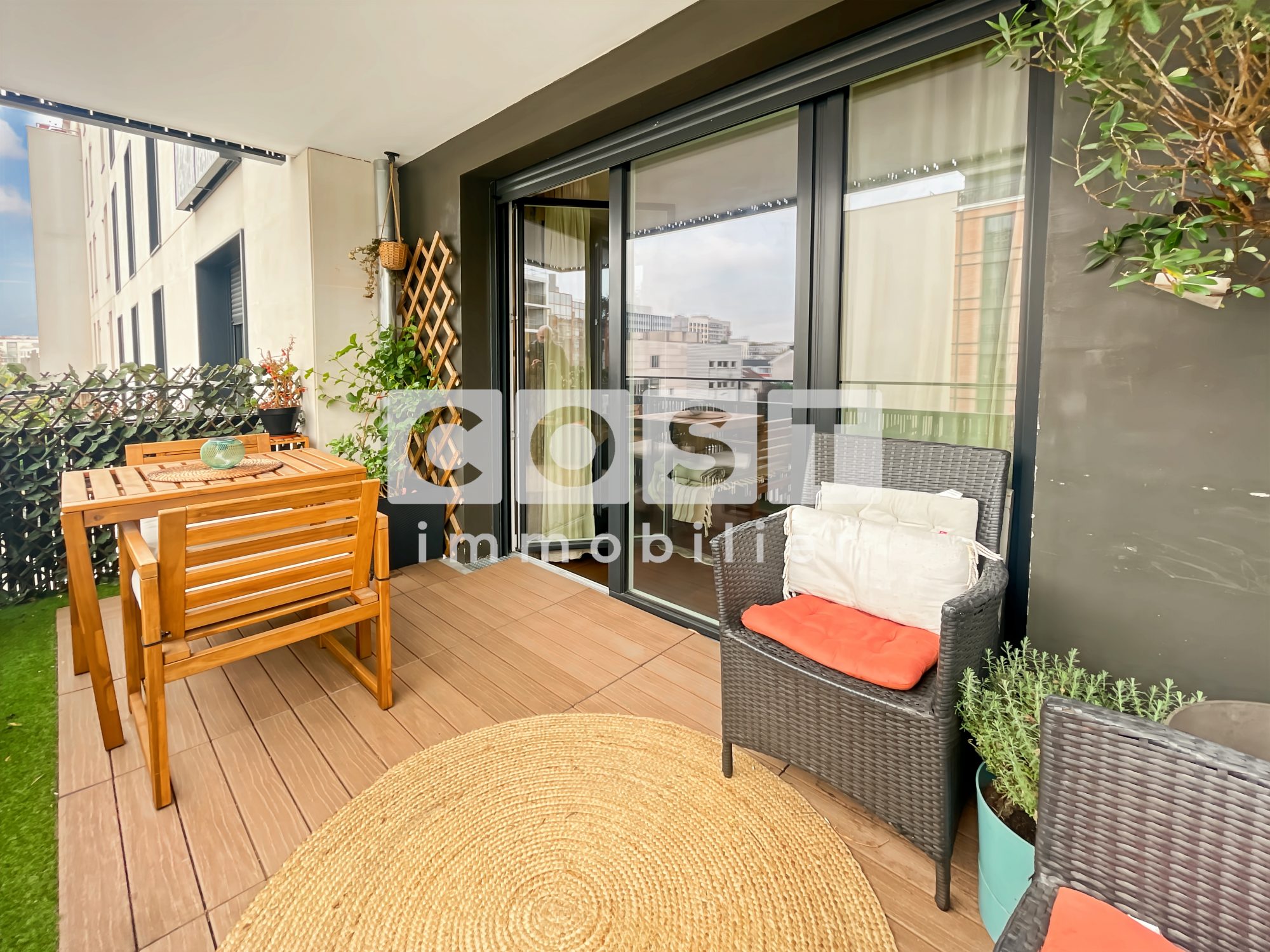 Appartement de deux pièces avec balcon filant, en étage d'un immeuble de standing. Il se compose d'une entrée desservant une cuisine équipée et séparée du séjour, d'une pièce à vivre, d'une salle de bains et d'une chambre.