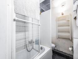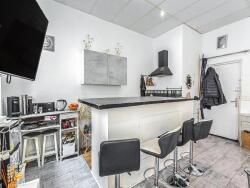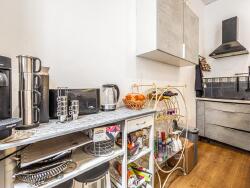 L'appartement se compose d'une chambre et d'une salle de bain situées en sous-sol, offrant une intimité appréciable. La cuisine, entièrement équipée, s'ouvre sur un espace de vie lumineux grâce à une hauteur sous plafond de 3,50 mètres, créant une atmosphère spacieuse et accueillante.