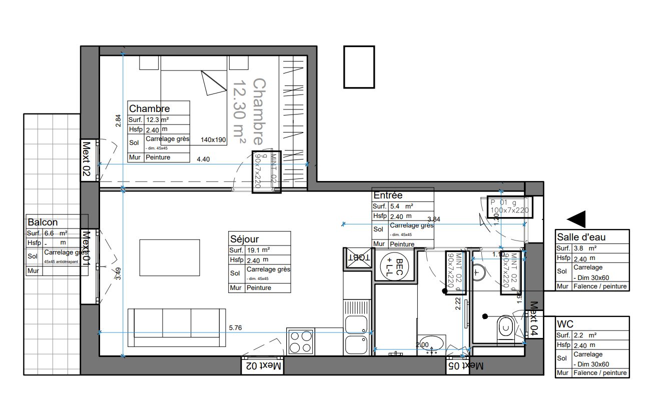 Situé au 1 er étage, il est traversant EST - OUEST et il se compose d'un séjour avec cuisine US de 28 m², de deux chambres confortables avec placards muraux et d'une salle d'eau avec WC.