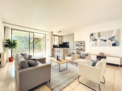 SAINTE-MAXIME EXCLUSIVITÉ MLS Au sein de la résidence sécurisée 'Les Coteaux du Préconil', profitant d'un environnement rêvé avec un joli parc, 2 piscines et 2 courts de tennis, venez découvrir ce 3 pièces traversant de 67 m² en rez-de-jardin d'un côté et au premier étage de l'autre. Au sud, l'espace de vie séjour/cuisine de plus de 33 m² profite d'une terrasse et d'un jardin de 42 m². Du jardin, vous profitez d'un accès direct au magnifique parc de la résidence. De l'autre côté, les deux chambres bénéficient d'une grande terrasse profonde de 16 m². Rare : un garage de plain-pied, un parking et une grande cave de 10 m² complètent ce bien. L'appartement climatisé est intégralement à rénover. Charges mensuelles : 170 par mois.