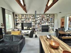 A l'étage se trouve deux autres chambres avec une salle de bain , puis la grande pièce de vie avec la cuisine, salle à manger et l'immense coin détente avec sa magnifique bibliothèque .Vous avez une belle terrasse dans la continuité de la pièce de vie pour profiter de l'exterieur au calme.