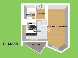 Il se compose d'une entrée distribuant un séjour lumineux de 20m² avec chambre attenante (séparée par des panneaux chinois) et la salle de bains intégrant les WC et lave-linge . La cuisine de 10 m², entièrement équipée (réfrigérateur, micro-ondes, mini lave-vaisselle, plaque de cuisson et hotte) est ouverte sur le salon et donne accès au balcon.