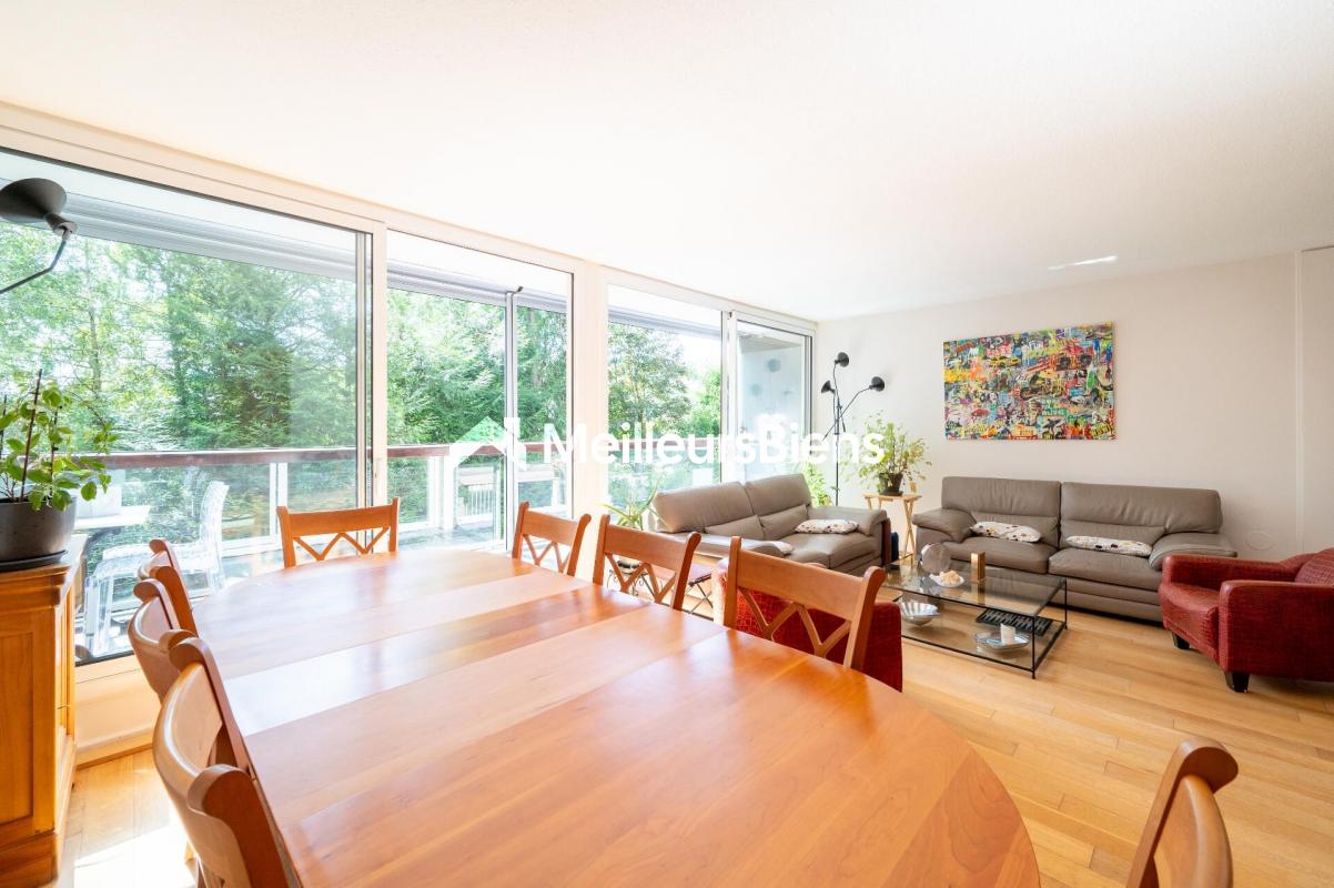 Dès l'entrée, vous serez séduits par les volumes généreux de ce bien. Il comprend un vaste séjour de 42,32 m², exposé Est, ouvrant par de larges baies sur un balcon de 14,84m², qui surplombe la pelouse centrale de la résidence, une cuisine séparée avec cellier et coté nuit, trois chambres spacieuses (18,66m², 14,84m² et 14,92 m²), avec chacune une salle de bains (ou salle de douche) et de grands rangements. A l'ouest, le second balcon de 14,79 m² offre de jolies vues dégagées sur l'environnement verdoyant de la résidence. L'appartement comporte trois WC, dont l'un est séparé. Toutes les portes-fenêtres sont équipées de double vitrages et de volets roulants motorisés. Une grande cave au sous-sol complète ce bien.