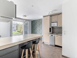 La cuisine équipée, ouverte sur le séjour avec un îlot central, est fonctionnelle et idéale pour partager des moments en famille ou entre amis.