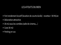 Cet appartement est loué à l'année EN LOCATION DE COURTE DUREE. Les recettes varient entre 28 et 41 K€/an. Le rendement locatif est attractif; il dépend du statut fiscal retenu