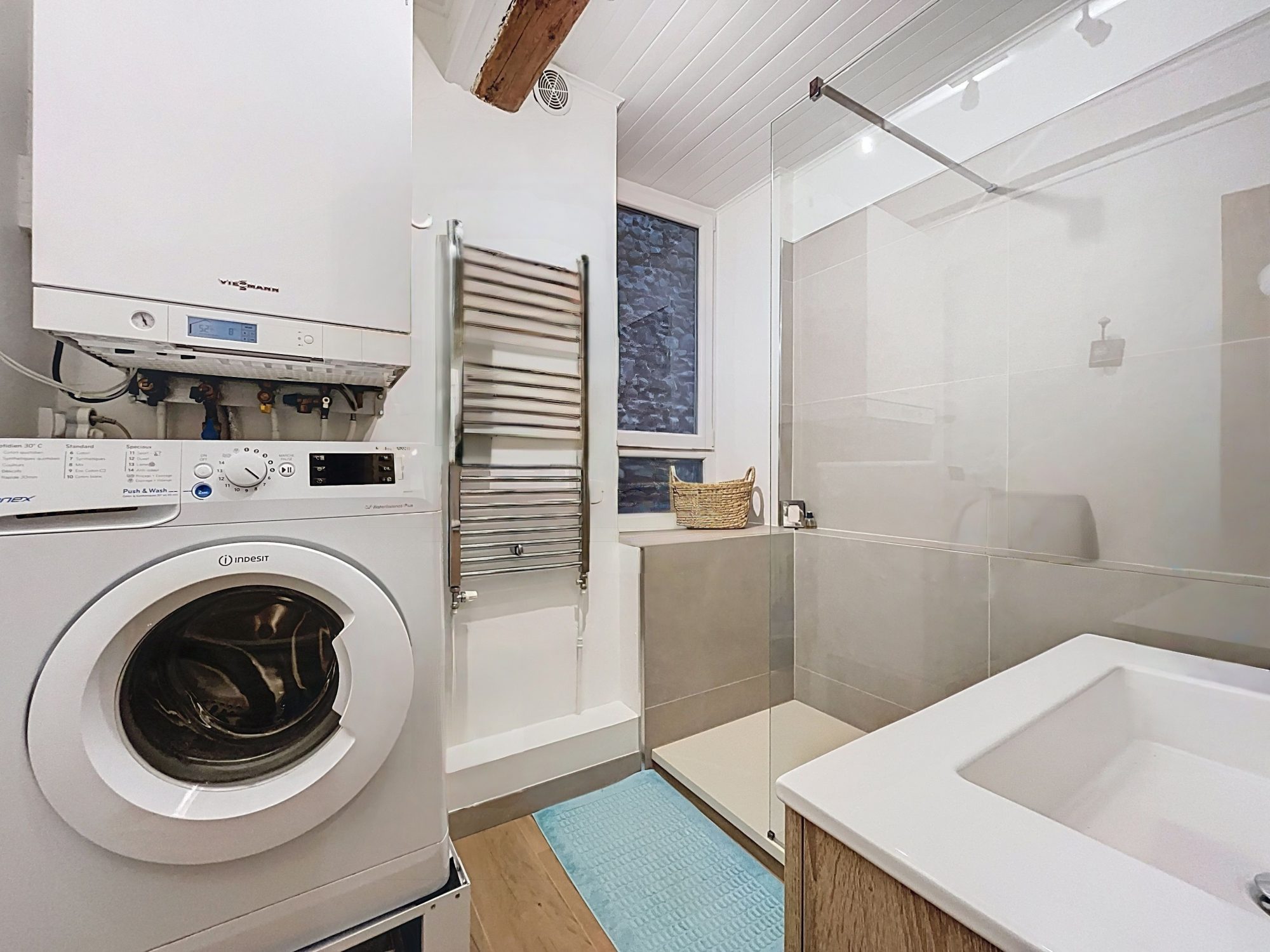 Double vitrage PVC Sols en carrelage et parquet flottant Volets roulants manuels Chauffage individuel au gaz Equipé fibre Parking collectif privé au sein de la copropriété