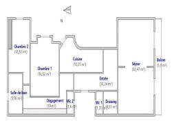 Il se compose d'une entrée avec dressing invités, d'une double réception lumineuse ouvrant sur un balcon ensoleillé, d'une cuisine indépendante avec cellier attenant, et d'un couloir aménagé de rangements desservant la partie nuit. Celle-ci comprend deux chambres de belles tailles (16,5 m² et 12,5 m²), ainsi qu'une spacieuse salle de bains avec baignoire et douche. Deux WC indépendants complètent l'ensemble.