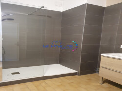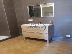 Au 1er niveau : cuisine équipée (éléments hauts et bas, hotte), double séjour lumineux et salle d'eau. Sur le palier menant à l'étage : WC.