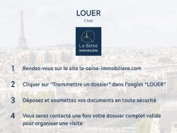 Avant toute demande de visite, merci de suivre ces étapes : 1. Rendez-vous sur le site de notre agence : LA SEINE IMMOBILIERE 2. Dans la rubrique 'LOUER', cliquez sur 'transmettre un dossier locatif' 3. Déposez votre dossier en toute sécurité. Une fois votre dossier de candidature complet reçu, nous vous contacterons pour organiser la visite du bien.