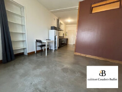 Appartement rénové au rez-de-chaussée d'un immeuble avec vidéophone comprenant une cuisine équipée donnant sur le séjour-salon, une salle d'eau avec WC et un coin chambre avec rangements.
