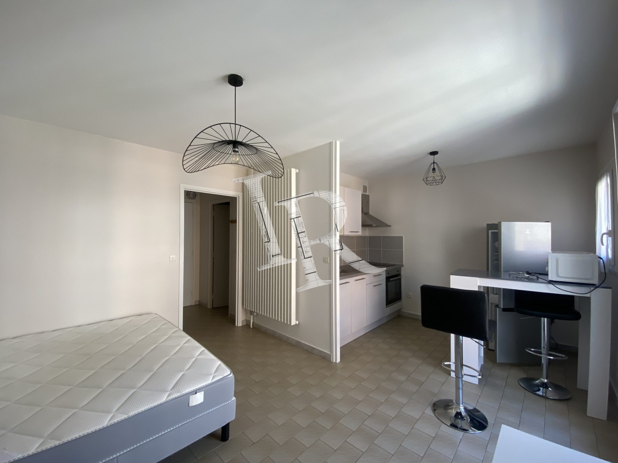 Appartement au 3ème étage d'un petit immeuble calme et sécurisé, composé d'un hall d'entrée avec placards, une salle de bain avec douche et toilettes, un séjour ouvert sur la cuisine. En mezzanine, une chambre.