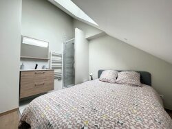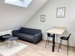 Tout le Confort dans ce F2 MEUBLÉ entièrement Rénové comprenant une entrée, une cuisine équipée (frigo/plaques induction/Hotte/Four/Lave Linge) + coin repas, une belle pièce à vivre lumineuse (Canapé, convertible), une chambre avec lit 2 places avec Literie de Qualité, un placard et une salle de bains avec douche + WC .