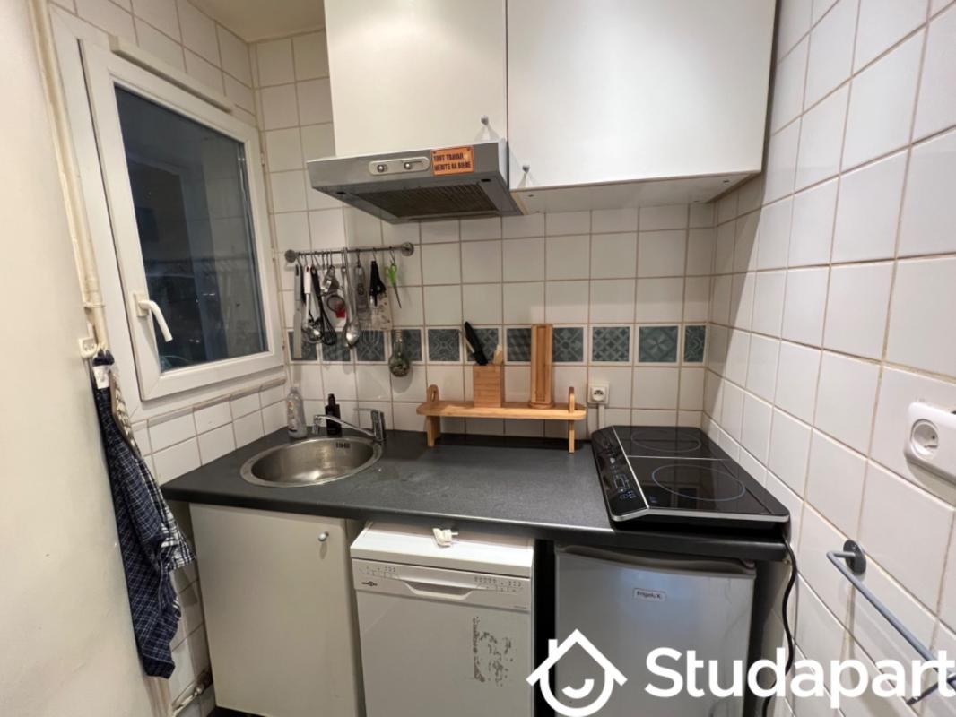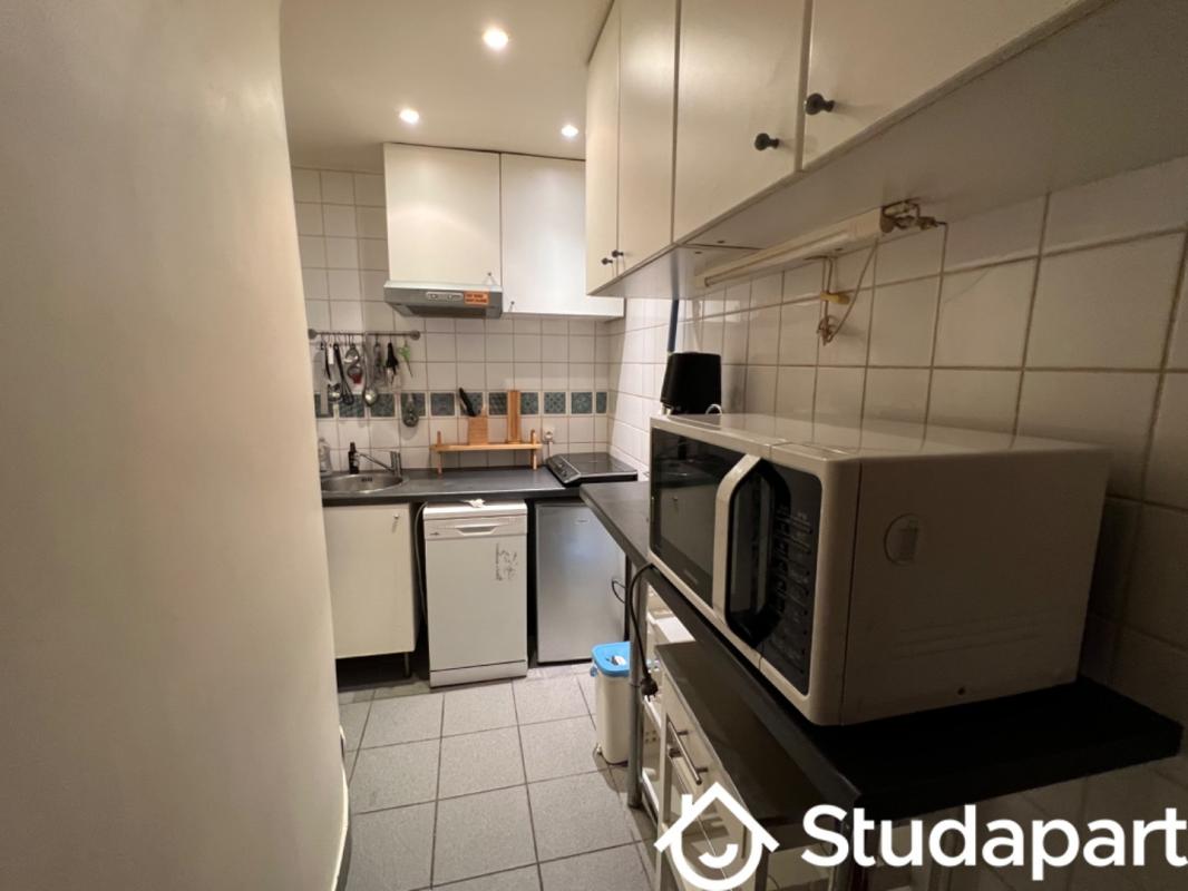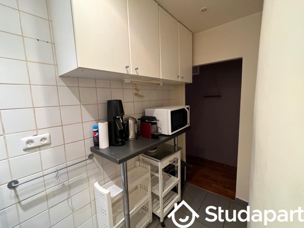 Caractéristiques : Surface : 25 m² 1 pièce avec espace nuit et bureau Cuisine partagée moderne et entièrement équipée (plaques, four, micro-ondes, frigos individuels pour chaque locataire) Salle de bain privative avec douche à l'italienne et WC Appartement rénové récemment, mobilier moderne (lit double, bureau, chaise, armoire) Immeuble bien entretenu