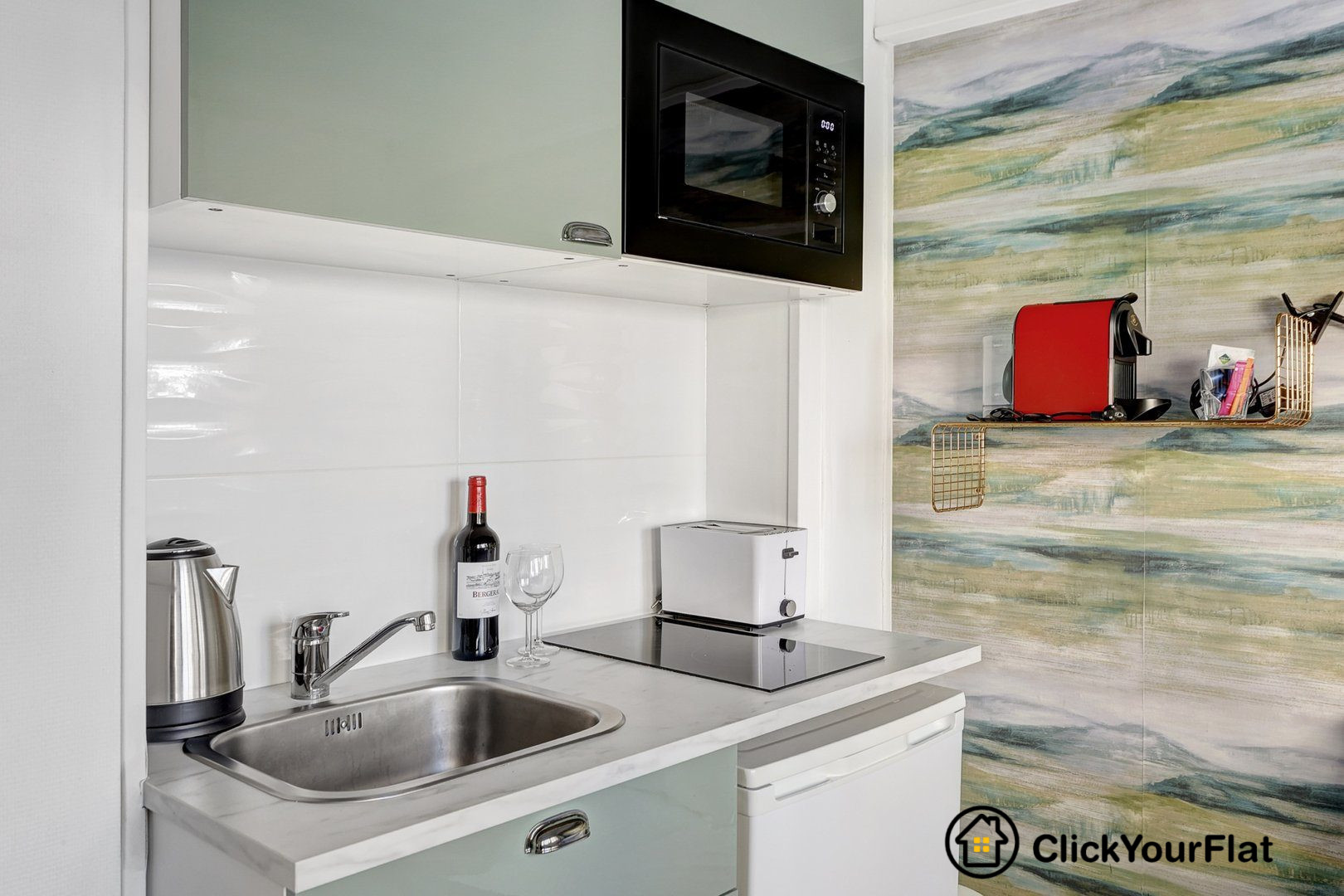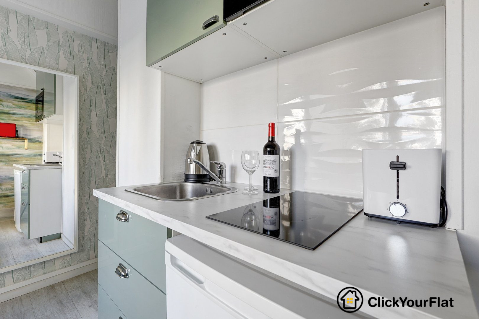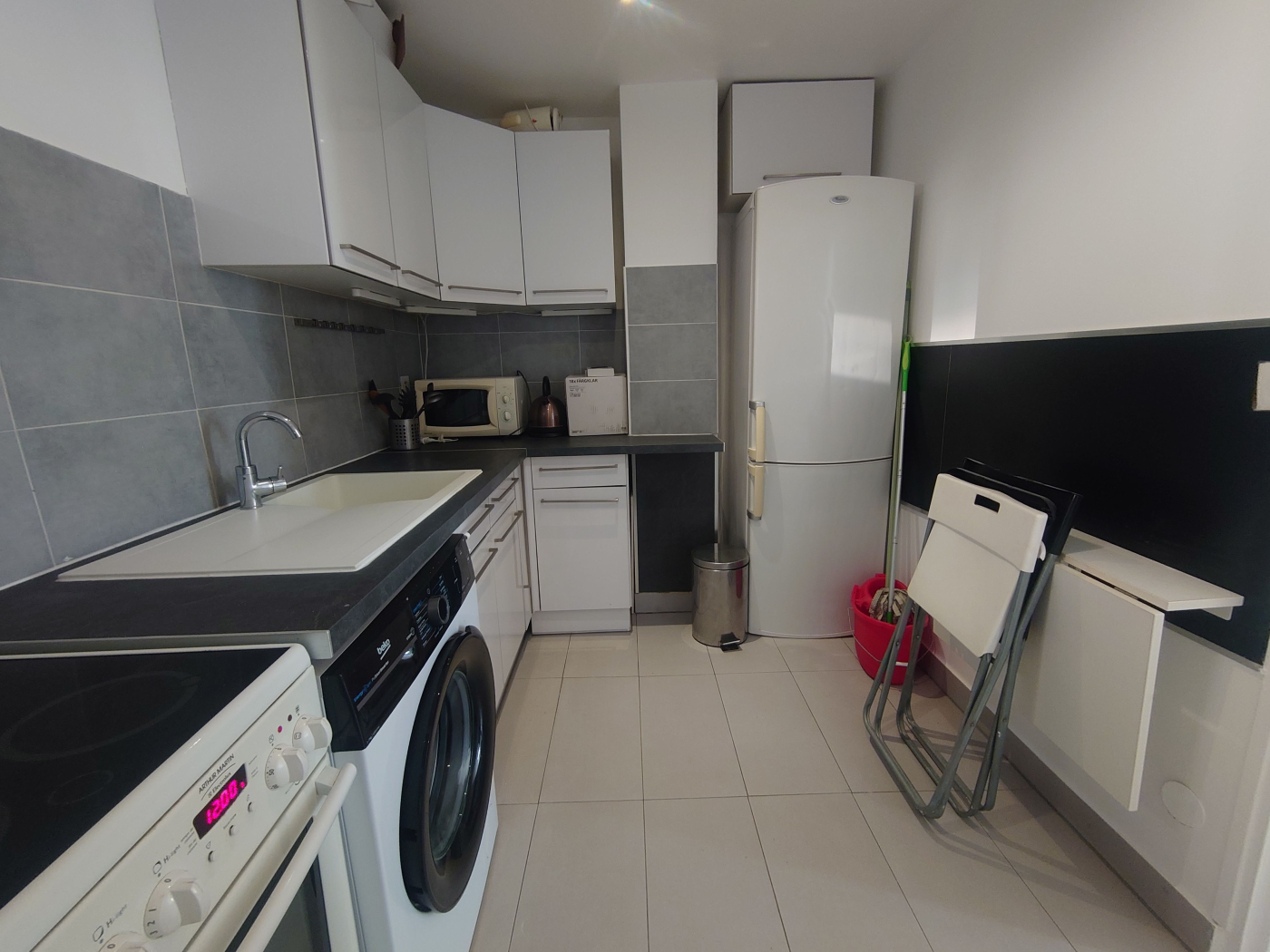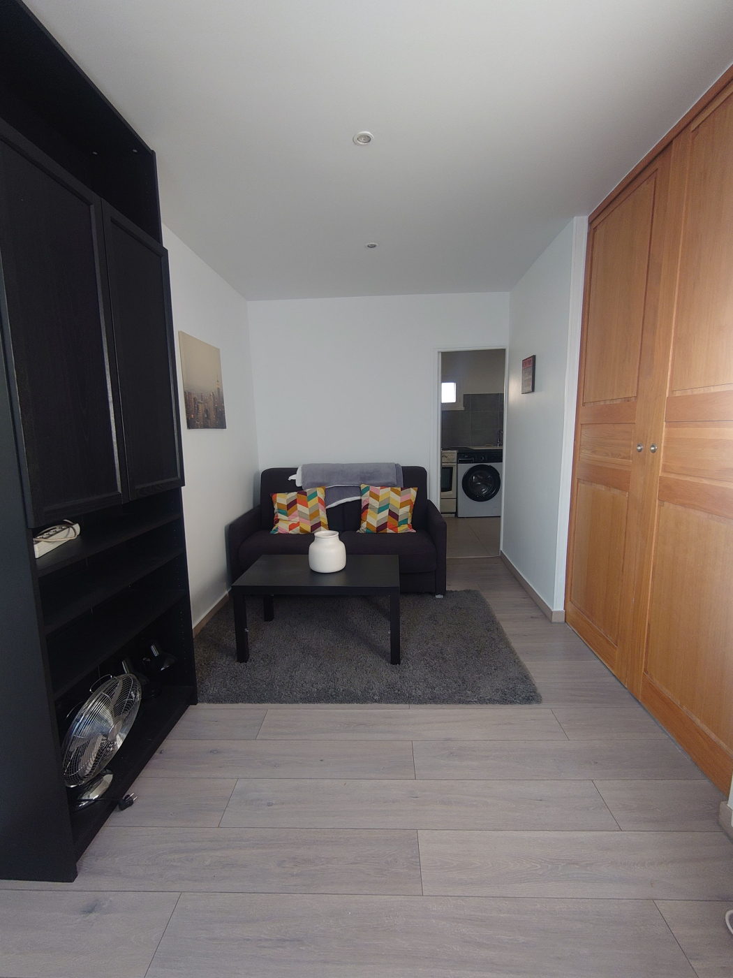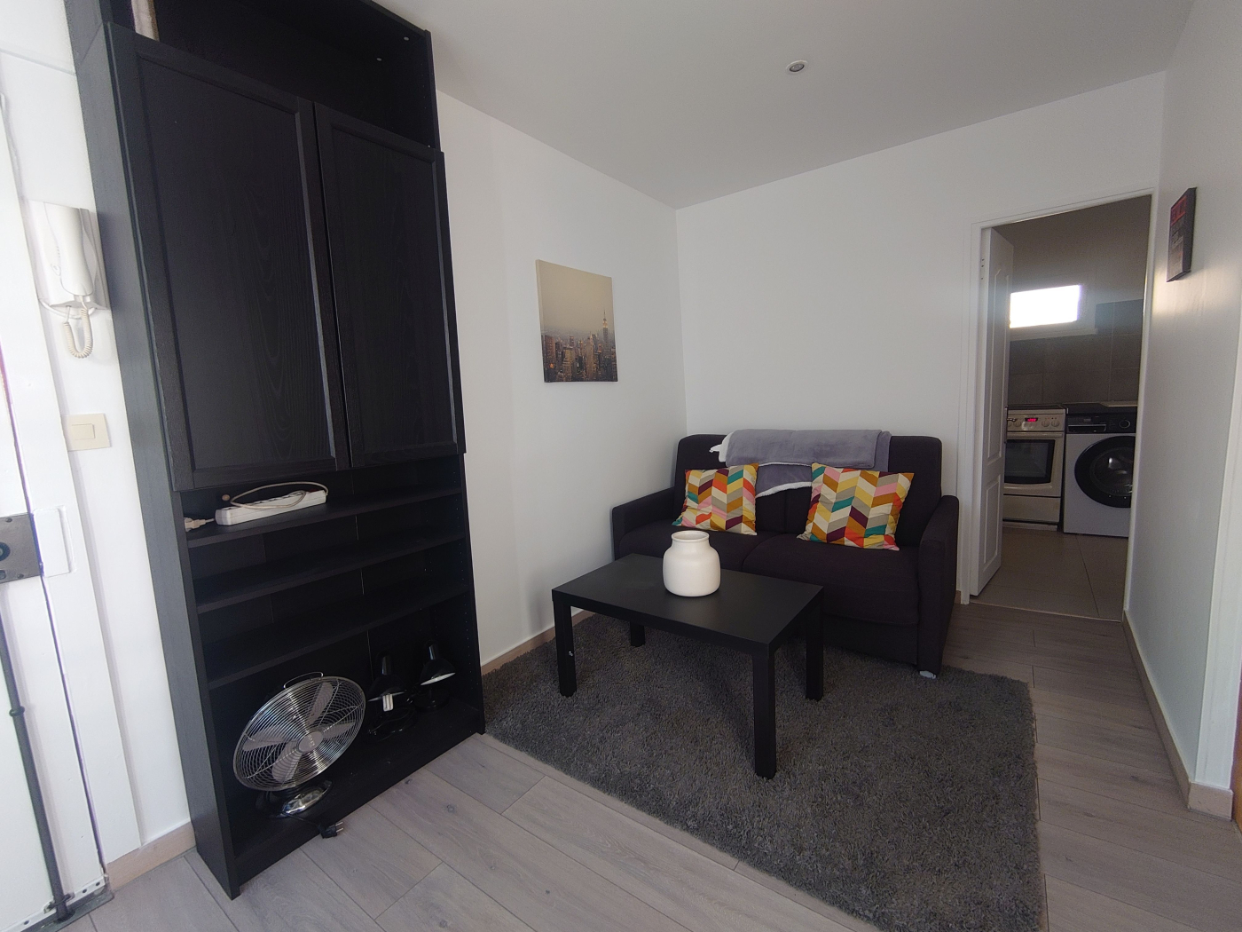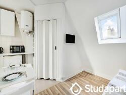 L'appartement est lumineux et bien agencé, comprenant une pièce principale avec coin nuit et espace bureau, une kitchenette équipée ainsi qu'une salle de bain moderne avec douche.