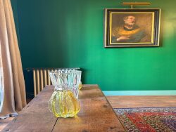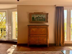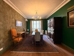 La cuisine, entièrement équipée et moderne, s'intègre parfaitement à cet espace raffiné où le charme de l'ancien parquet, cheminées et moulures d'époque se marie harmonieusement avec un mobilier mêlant design contemporain et pièces classiques.