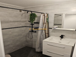 La salle d'eau, contemporaine, comprend une douche, les WC sont séparés pour plus de praticité.