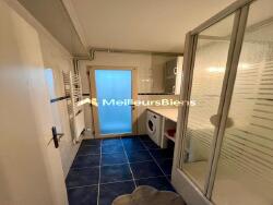 La cuisine aménagée de 8,60 m², en bon état général, est équipée (plaques, four, etc.), prête à l'emploi. Le parquet stratifié renforce le confort et l'aspect chaleureux de l'appartement.