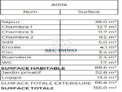 Découvrez cet appartement T4 exceptionnel de 88.60 m², un véritable havre de paix en plein coeur de la ville. Cet appartement, baigné de lumière naturelle, vous offre un cadre de vie idéal pour une famille ou pour ceux qui recherchent un espace généreux et confortable. Imaginez-vous dans ce magnifique appartement où chaque pièce a été conçue pour votre bien-être. Les trois chambres spacieuses vous offrent des espaces intimes et calmes, parfaits pour se reposer après une longue journée. La salle de bains, moderne et fonctionnelle, est un véritable sanctuaire de détente. Le salon et la cuisine ouverte s'ouvrent sur un espace de vie convivial, idéal pour recevoir vos proches et créer des souvenirs inoubliables. La cuisine équipée, avec ses appareils haut de gamme, est un véritable plaisir pour les amateurs de cuisine. Cet appartement est également doté d'un WC indépendant, offrant une touche de modernité et de praticité à votre quotidien. Les finitions de haut standing et les matériaux de qualité vous garantissent un confort optimal et une durabilité à toute épreuve. Ne manquez pas cette opportunité unique de vivre dans un appartement qui allie élégance, confort et fonctionnalité. Contactez-nous dès aujourd'hui pour organiser une visite et laissez-vous séduire par ce joyau immobilier. À proximité, vous trouverez plusieurs commodités pratiques pour faciliter votre quotidien, telles qu'un supermarché à quelques pas, une école primaire à 10 minutes à pied, et plusieurs parcs et espaces verts à moins de 15 minutes en voiture.