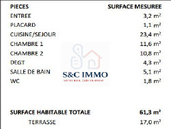Imaginez-vous dans un salon spacieux baigné de lumière naturelle, ouvrant sur une terrasse de 17 m², idéale pour des moments de détente en plein air. Les deux chambres, dont une suite parentale, vous offrent un havre de paix et d'intimité. La salle de bains moderne et le WC indépendant complètent ce tableau de confort et de praticité.