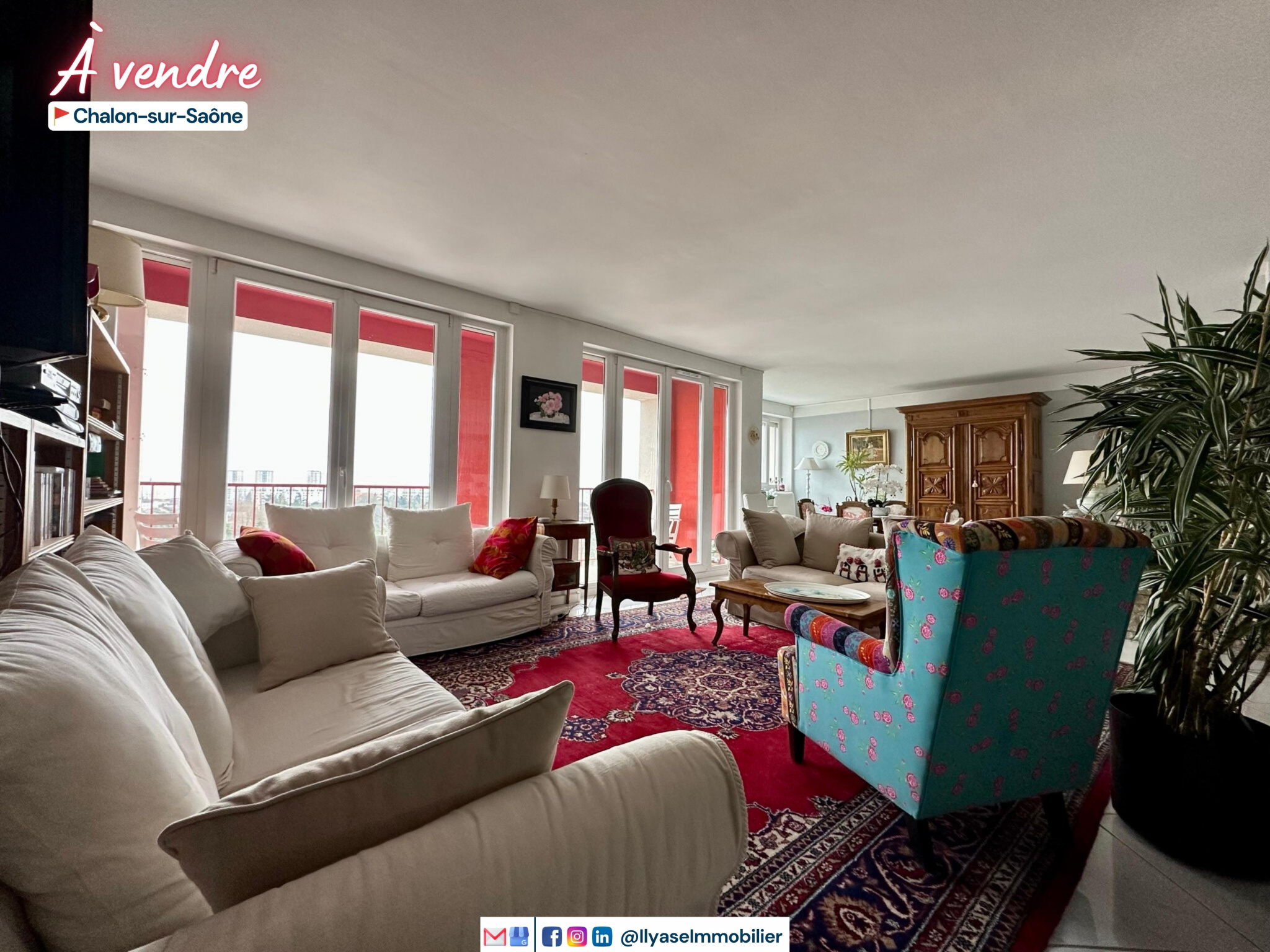 Appartement situé au 1 er étage comp séjour-salon , cuisine équipée donnant sur terrasse et jardin, wc, salle de bains, 4 chambres. Parking.