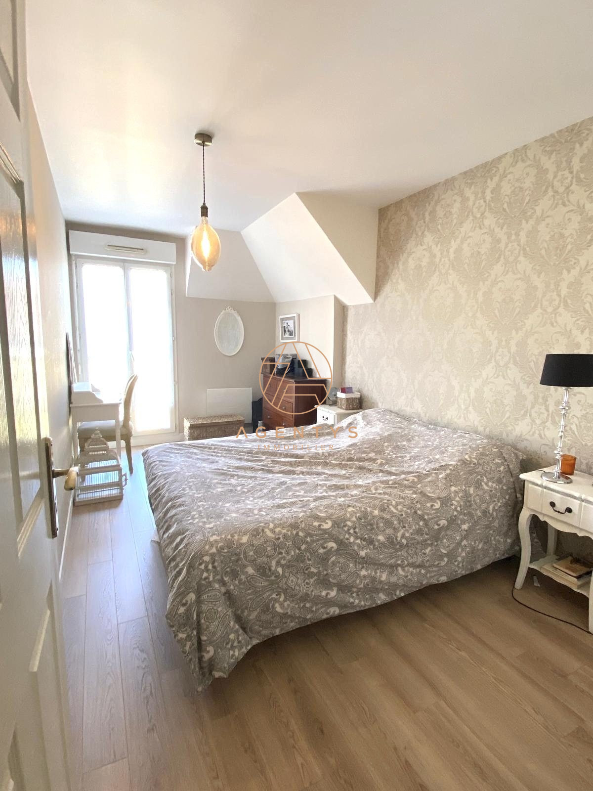 Il se compose d'une entrée avec placard, un séjour cathédrale baigné de lumière naturelle, une cuisine américaine équipée et aménagée du groupe MOBALPA, une salle d'eau avec wc. A l'étage un palier desservant deux chambres spacieuses, une salle de bain avec wc.