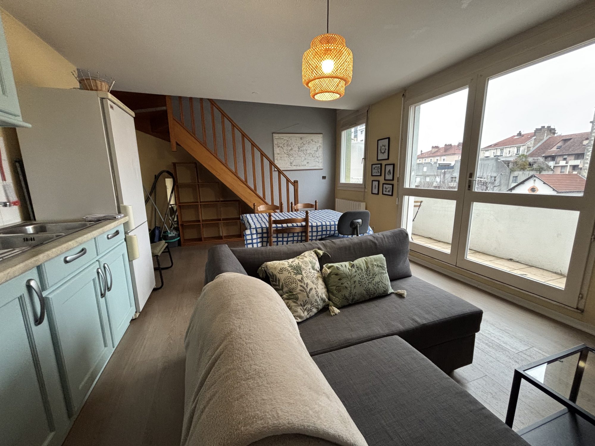 L'appartement comprend une belle pièce de vie ouverte sur une cuisine aménagée et équipée, une grand terrasse avec cellier attenant, une chambre et sa salle d'eau privative avec douche à l'italienne et un WC suspendu séparé. Le séjour est orienté à l'Est et donne sur la rue Thiers tandis que la chambre est orientée Ouest et donne donc au calme, sur l'arrière de l'immeuble.