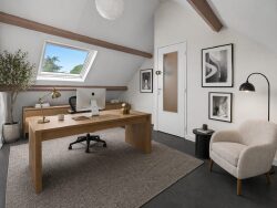 À l'étage l'espace flexible Une seconde pièce, lumineuse grâce à ses velux, qui s'adapte à vos projets : une seconde chambre parentale, une chambre d'enfant avec coin bureau, ou un espace bureau dédié au télétravail. Vous décidez.