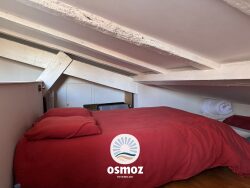 Une mezzanine avec coin nuit et une terrasse en roof top avec une vue imprenable sur les tours de La Rochelle.